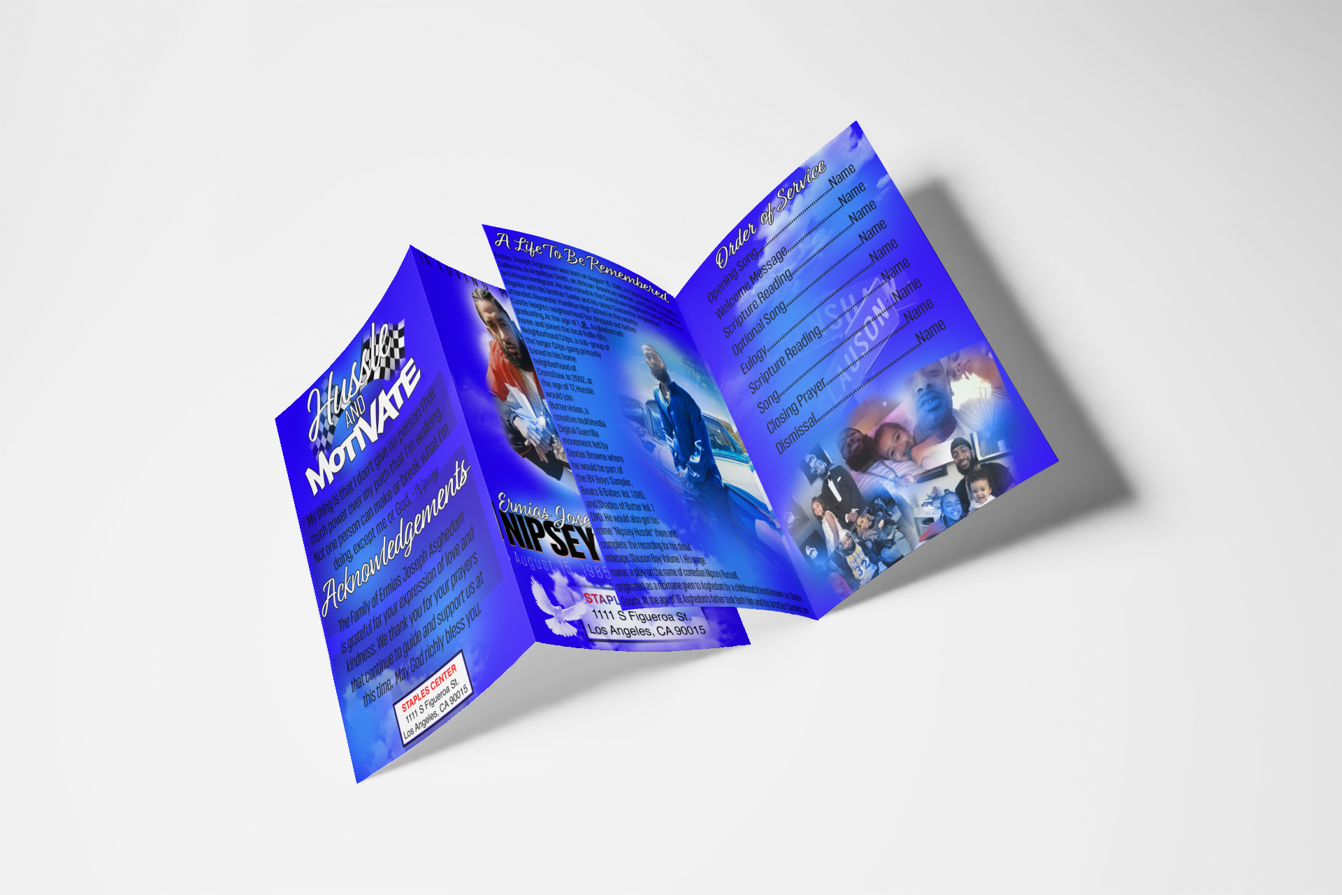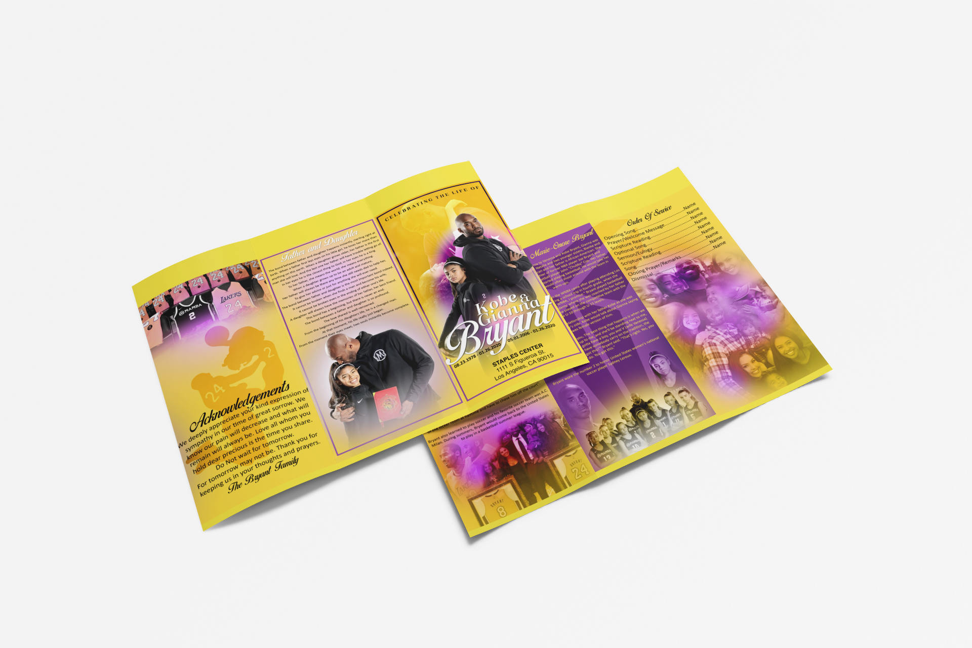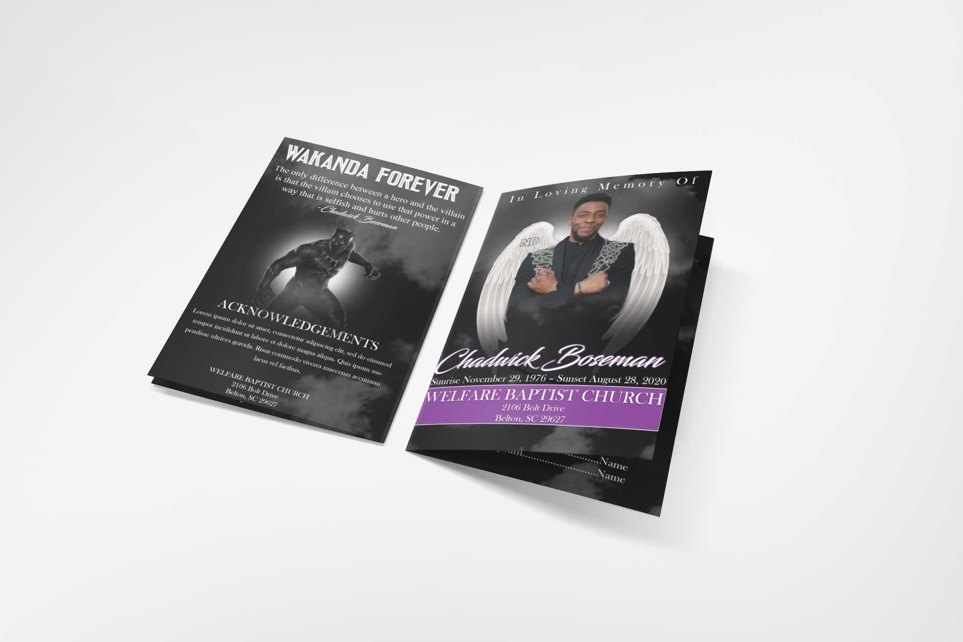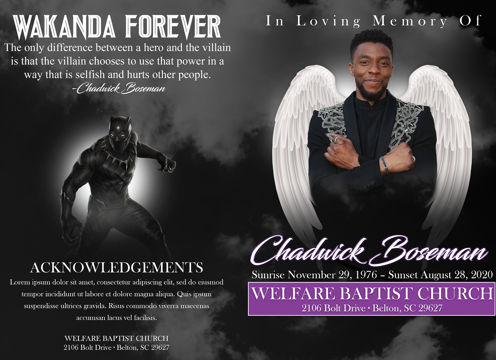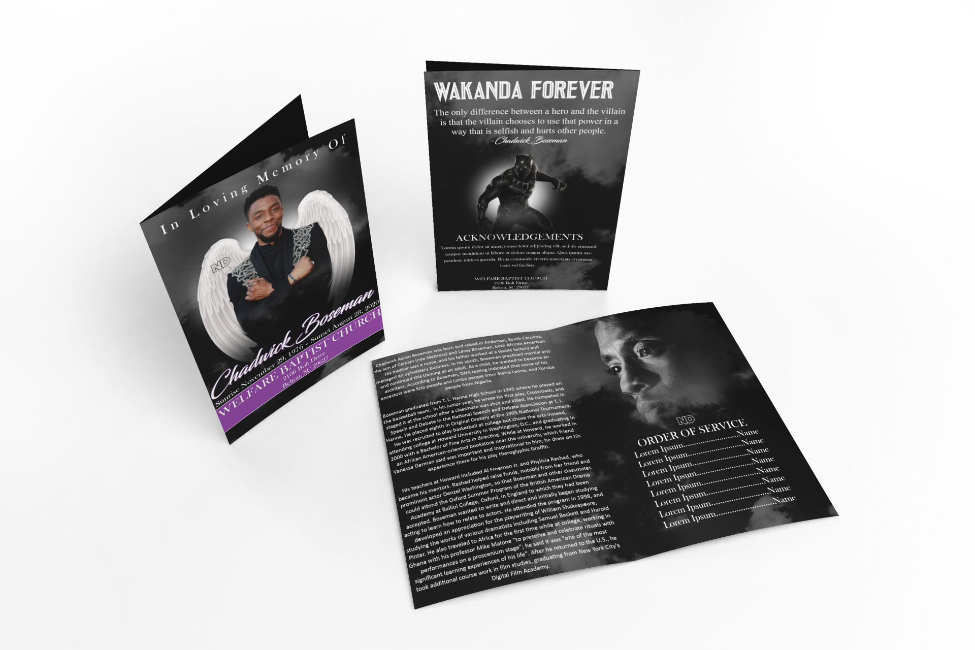 Here I showcase some obituary designs I did featuring Chadwick Boseman, Nipsey Hussle, and Kobe and Gigi Bryant. Done in Photoshop.